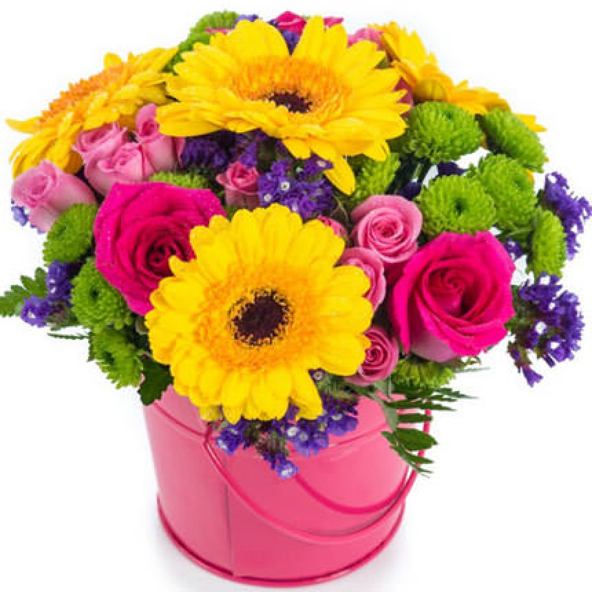 Описание композиции: Порадуйте любимого человека ярким букетом цветов в декоративном ведре! Такой презент уж точно заставит улыбнуться и порадоваться не только самому подарку, а и просто прекрасному осеннему дню! Состав композиции: 4 желтые герберы, 3 розовые розы, 3 ветки кустовой розовой розы, 3 ветки зеленой хризантемы сантини, статица, зелень, кашпо-ведро, флористический материал.