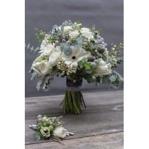 Н. Свадебный букет 6, букеты, Хамилацум, гербера, роза бомбастик, эвкалипт, бруния, тюльпан, цинерария