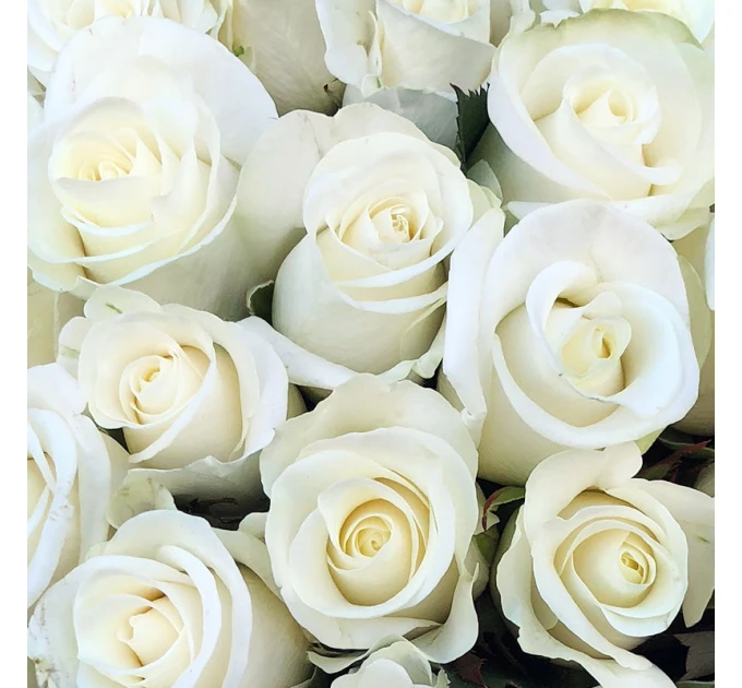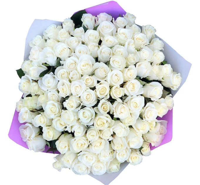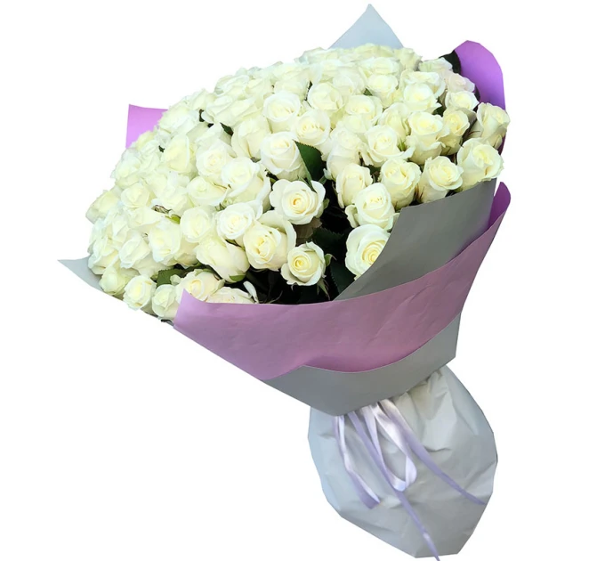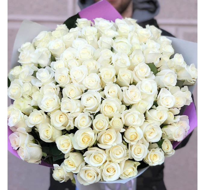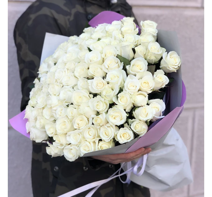 Букет з 101 біла троянда. зростом 50 см, пишними бутонами і тонкими пелюстками, що ніби сяють зсередини. Доставка квітів зробить щасливим одержувача і довго радуватиме око своєю свіжістю та красою. Такий величезний букет із 101 білої троянди здивує будь-яку дівчину!