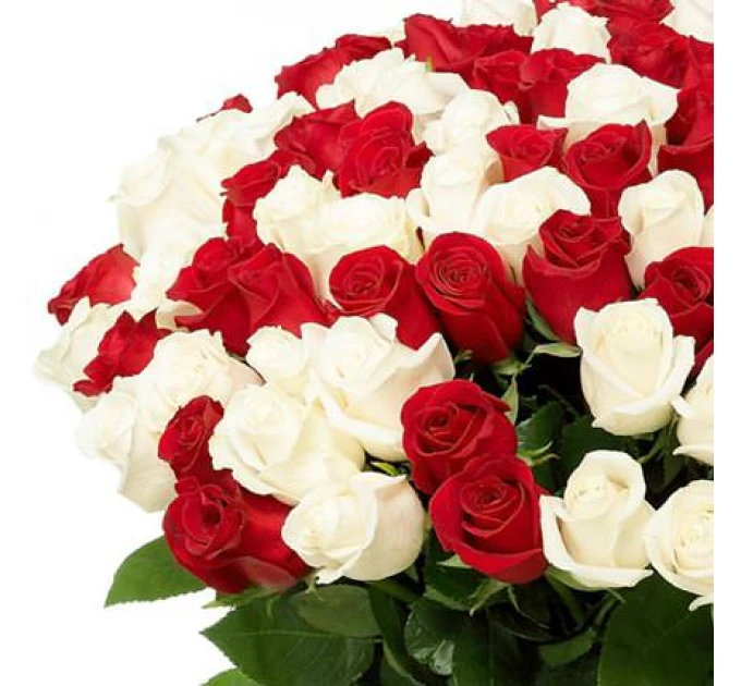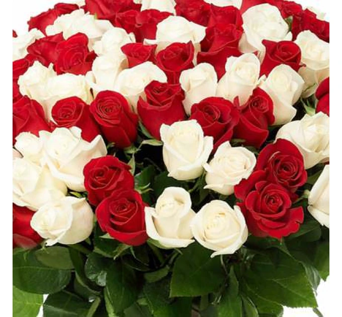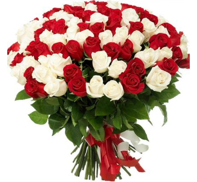 Опис букета: Грандіозний букет білих і червоних троянд здатний виразити красу і щирість Ваших почуттів! Склад: 101 червона та біла троянда, оформлення.