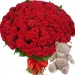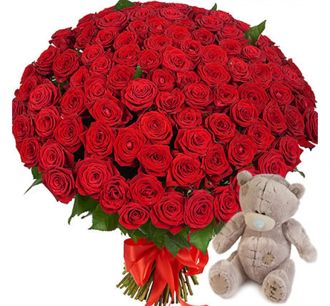 Опис букета: Червона троянда завжди в моді! А така хмара червоних троянд - чудовий подарунок для неї! Склад: 101 червона троянда. Акція! М'яка іграшка ведмедик у подарунок.