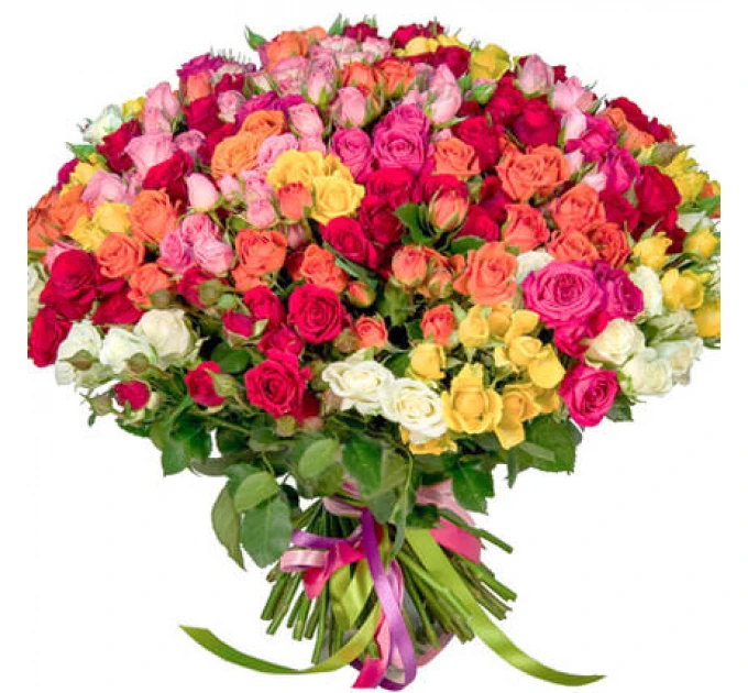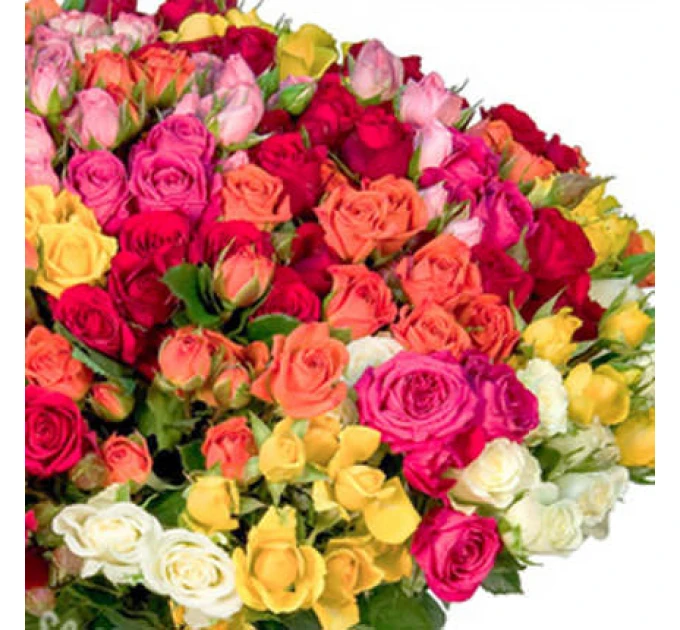 Опис букета:Подаруйте справжній феєрверк почуттів з яскравих кущових троянд - здивуйте улюблену!Склад: 101 гілка різнокольорової кущової троянди.