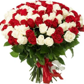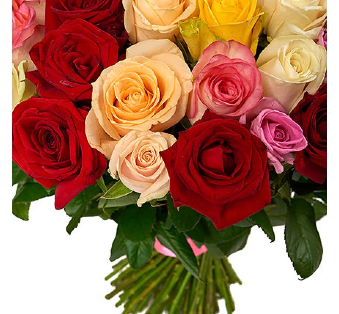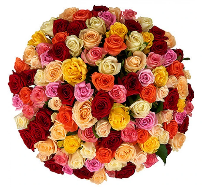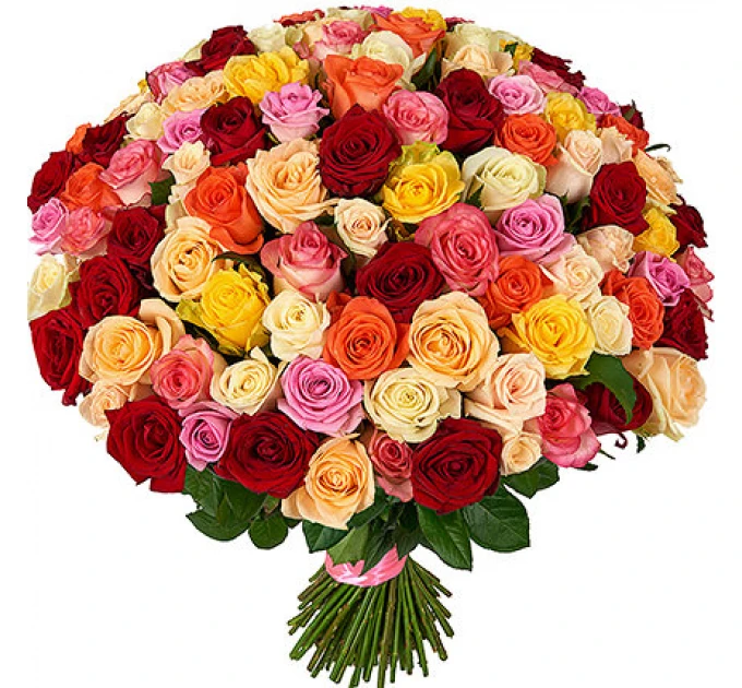 Опис букета: Різнобарвний мікс з троянд - чудовий яскравий феєрверк емоцій, який здивує та порадує Вашу кохану! Склад: 101 кольорова троянда, оформлення.