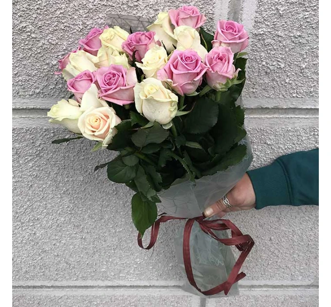 Придбати 19 троянд мікс «бежево-рожева» 60 см у Києві на Оболоні з доставкою✅ ви можете в нашому магазині. Якщо виникли питання щодо товару, ви можете написати в наш чат менеджеру і ми з радістю вам допоможемо!