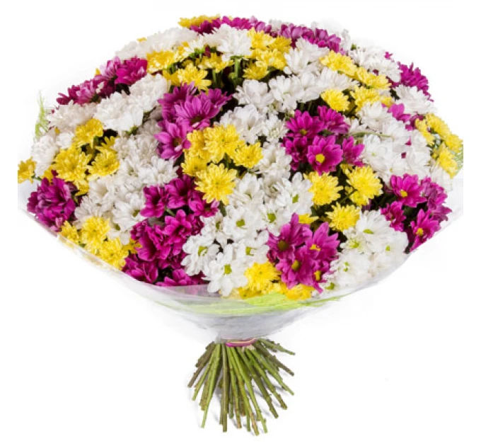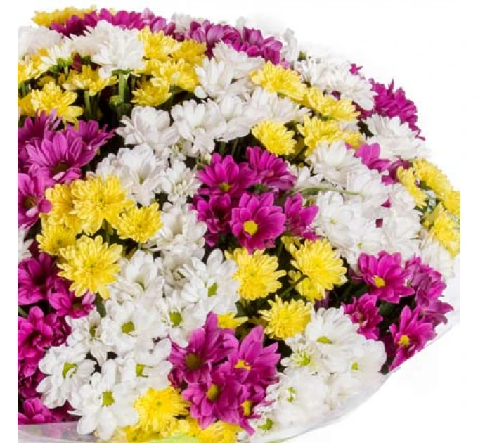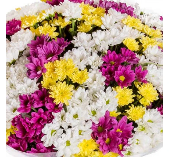 Опис букета: Дивовижне поєднання простоти, надзвичайної яскравості та урочистості залишить у душі Вашого отримувача найтепліші почуття! Склад: 51 гілка різнобарвної хризантеми, оформлення.
