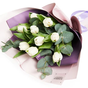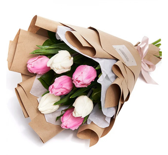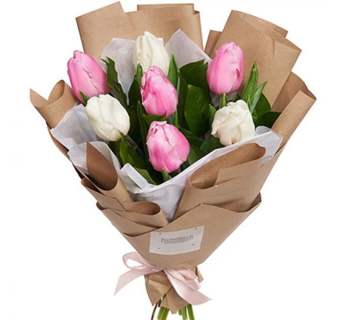 7 білих та рожевих тюльпанів, оформлення.