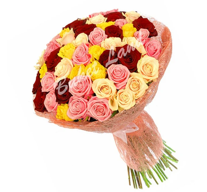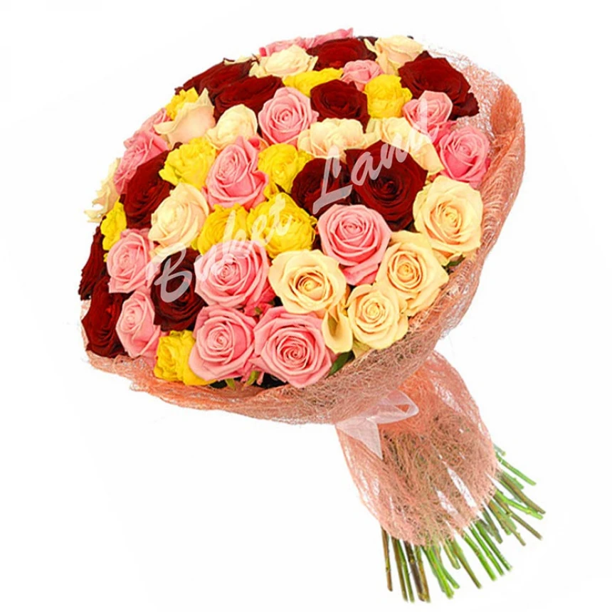 Придбати 71 троянда мікс «червоно-рожево-жовто-бежева» 60 см ❤ на Оболоні з доставкою✅ ви можете в нашому магазині. Якщо виникли питання щодо товару, ви можете написати в наш чат менеджеру і ми з радістю вам допоможемо!