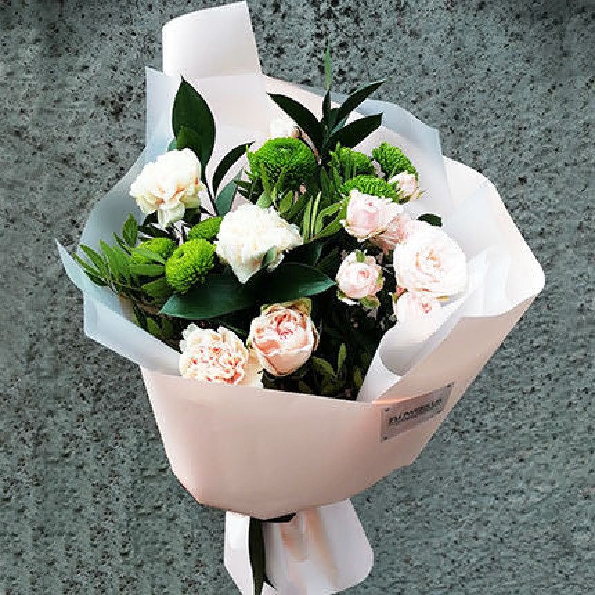 3 кремові троянди, 3 гвоздики, 2 гілки зеленої хризантеми, гілка кущової троянди, зелень, оформлення.