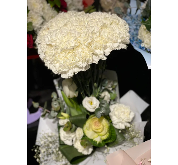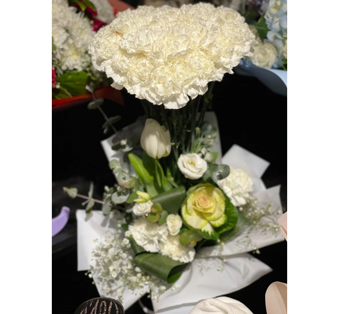 Склад: Гвоздика, гіпсофіла, евкаліпт, еустома, брасика, тюльпан, аспедистра.