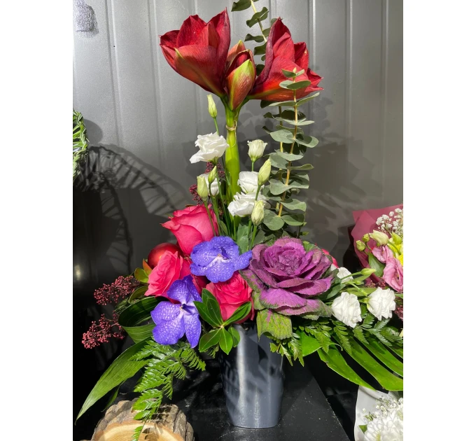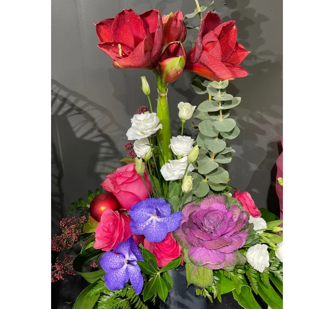 Склад: Еустома, евкаліпт, брасика, Ванда, листя Монстери, троянда Лола, арахніодіс, аспедистра, скімія.