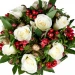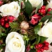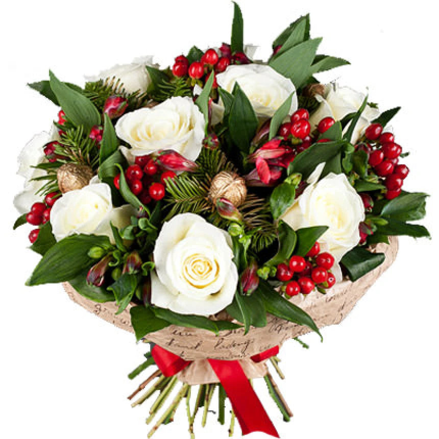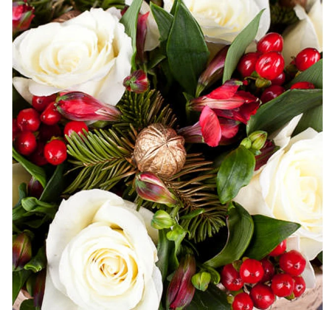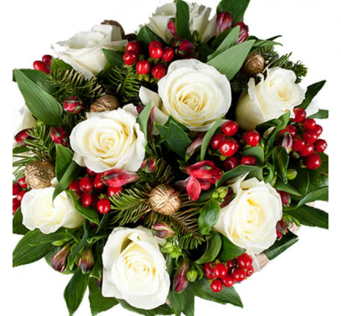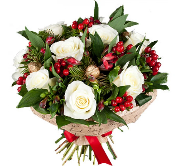 9 білих троянд, 4 альстромерії, гіперикум, ялинові гілки, новорічний декор, упаковка.