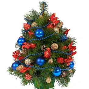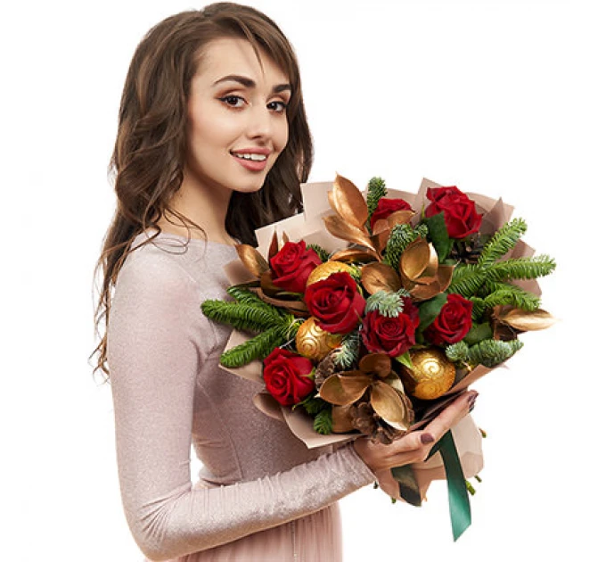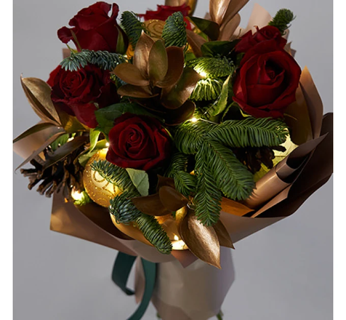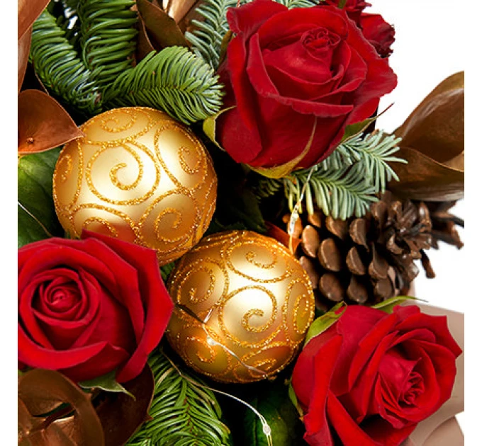 Опис букета: Розкішний букет стане чудовим подарунком до новорічних свят для близької людини, друга чи колеги! Склад: 7 червоних троянд, 3 новорічні прикраси, рускус, шишки, ялинові гілки, новорічний декор, упаковка.