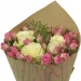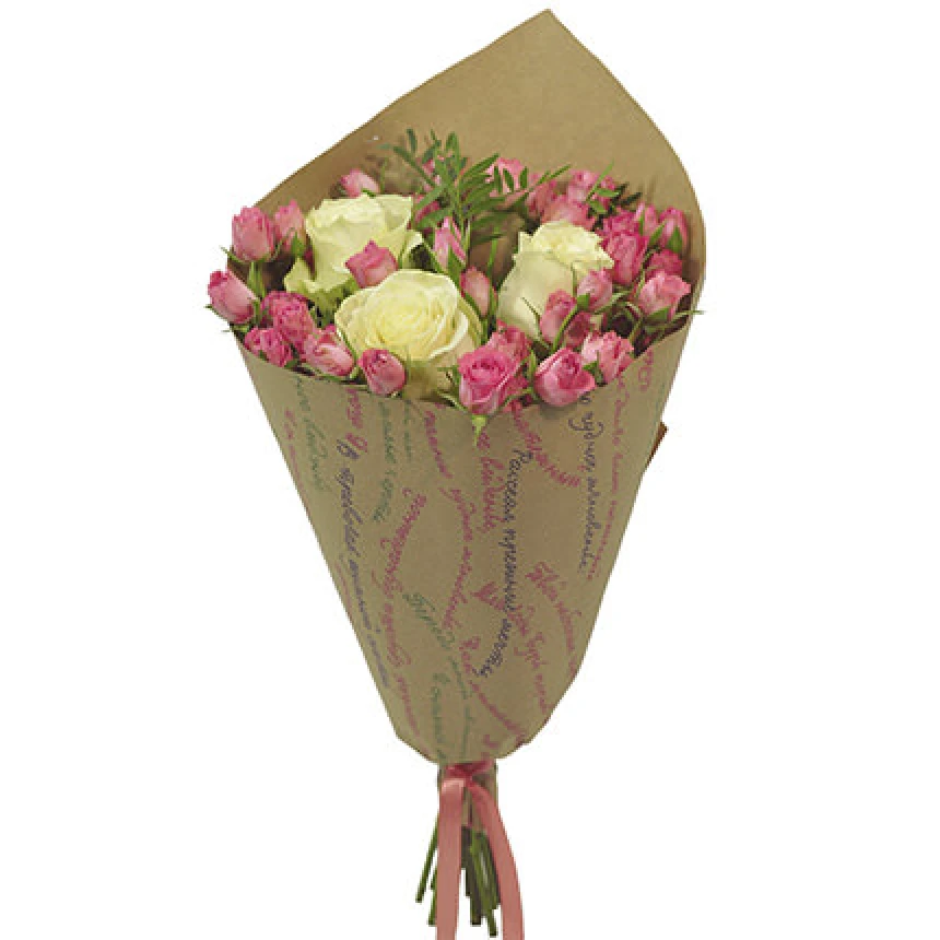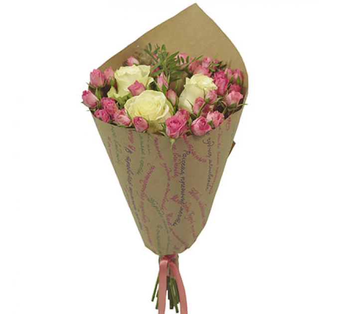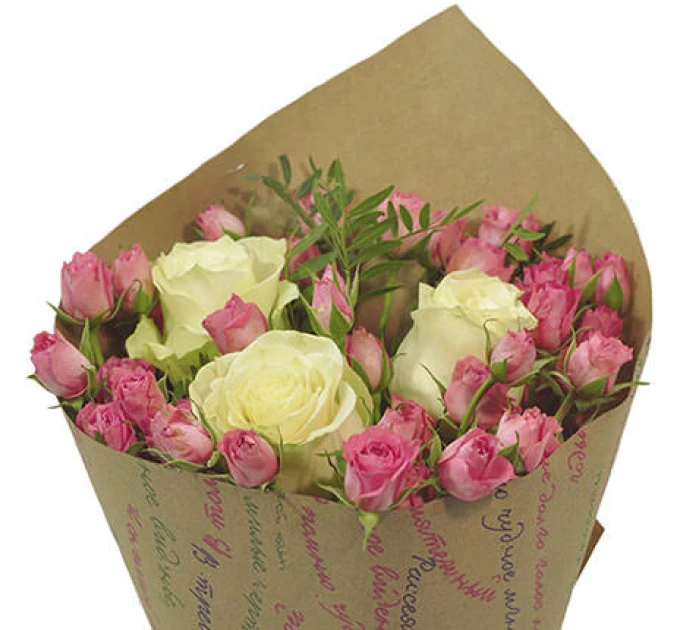 3 білі троянди, 6 гілок трояндової троянди, зелень, оформлення може відрізнятися.