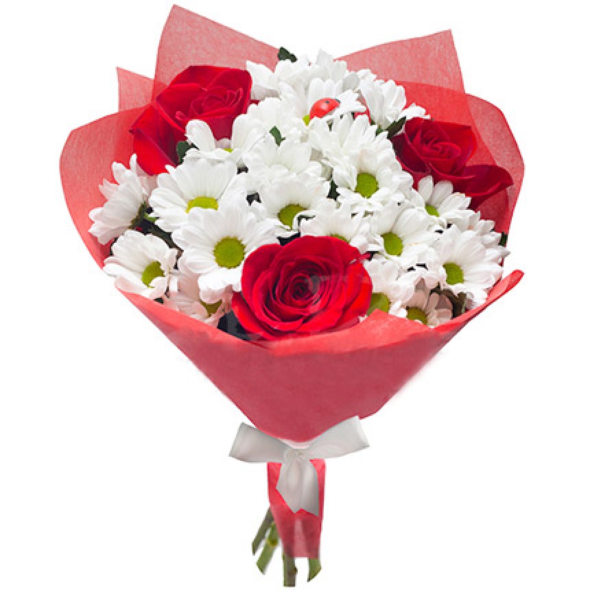 Опис букета: Шукайте підходящий момент, щоб сказати про свої почуття? - Подаруйте ароматний букет білих і червоних квітів, скажіть про своє кохання на мові квітів! Склад: 3 червоні троянди, 4 гілки білої ромашкової хр