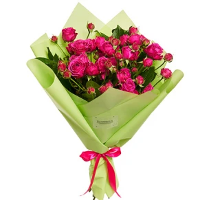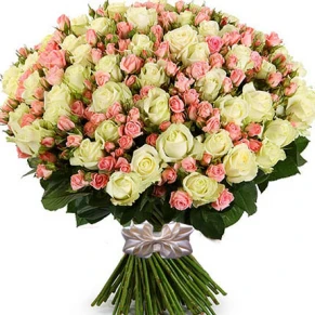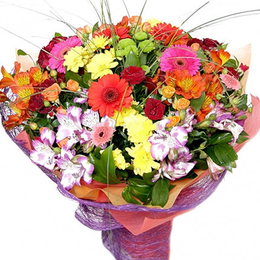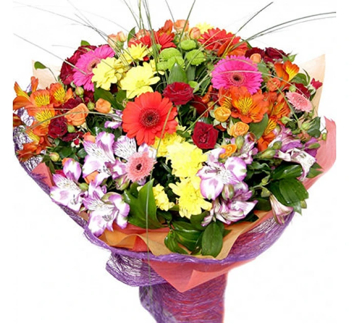 9 червоних троянд, 5 кущових кремових троянд, 6 гілок різнокольорової хризантеми, 7 різнокольорових гербер, 7 альстромерій, зелень, упаковка може відрізнятися.