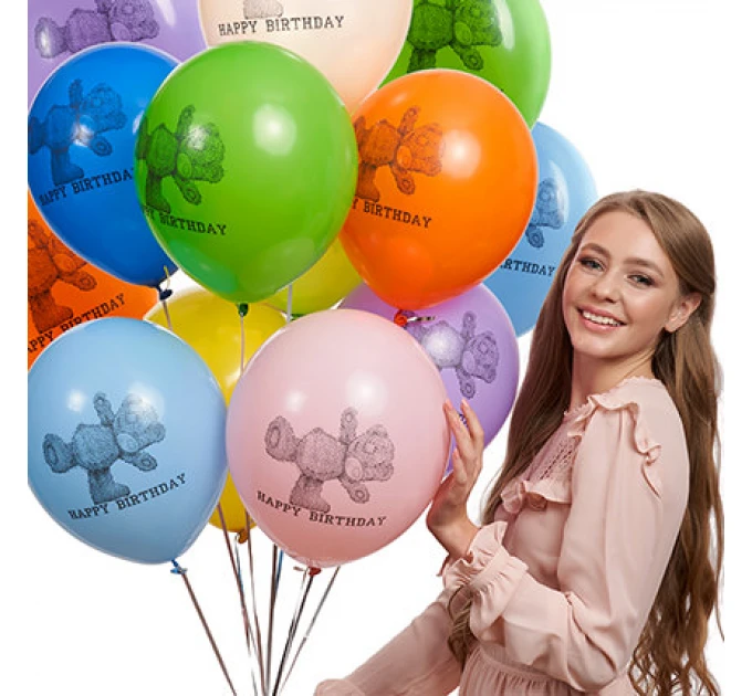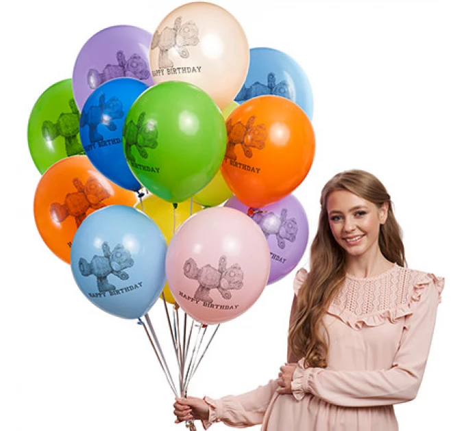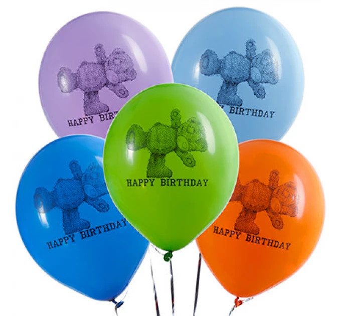 Ми додаємо в кулю спеціальний розчин, який збільшує час польоту куль у 4-5 разів (від 2-х днів до 2-х тижнів) – яскраві кулі довго радуватимуть Вашого одержувача! Склад:5 різнокольорових латексних кульок гелієвих з принтом. Колір:різнокольорові з принтом тедді та день народження.