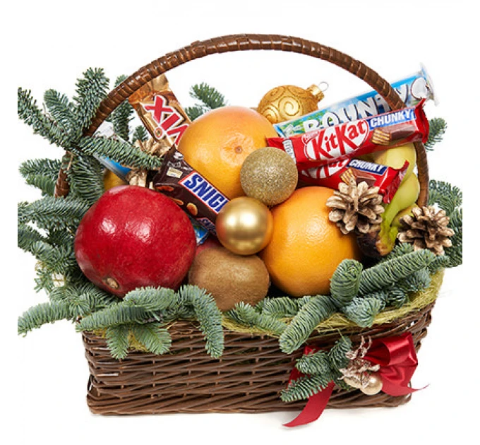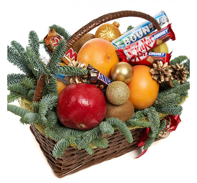 Склад: 2 гранати, 4 грейпфрути, 5 бананів, 4 ківі, 2 батончики "Kit-Kat", 2 батончики "Mars", 2 батончики "Bounty", 2 батончики "Snikers", 2 батончики "Twix" , новорічні прикраси, кошик, ялин, флористичний матеріал. (Кошик доставляється в прозорій целофановій упаковці.)