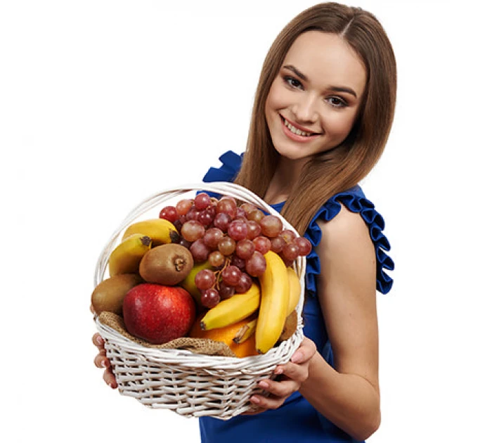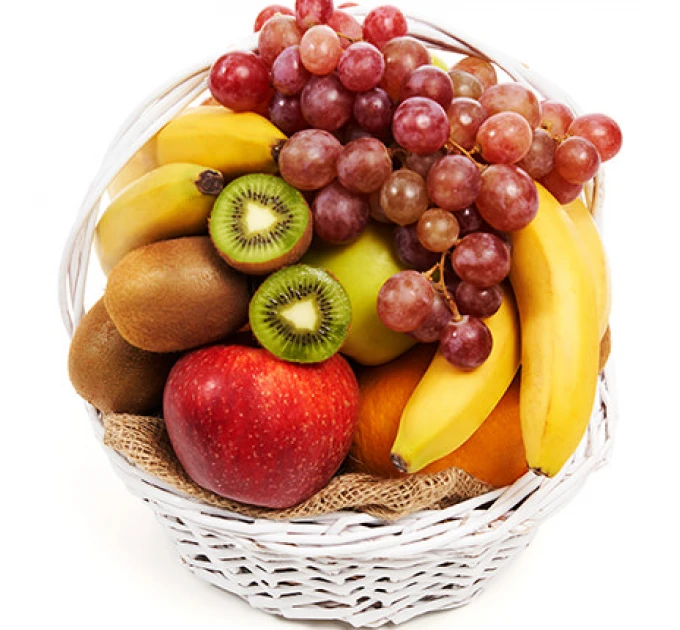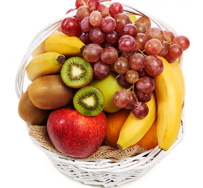 Опис кошика: Найкращий подарунок у будь-яку пору року та в будь-яку погоду – це кошик смачних та ароматних фруктів! Склад кошика:виноград, ківі, банани, яблука, апельсини, кошик, декор. (Кошик доставляється в прозорій целофановій упаковці.) Вага кошика:до 3 кг.