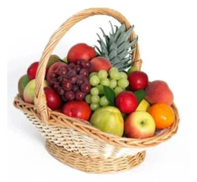 Опис кошика: Чудовий кошик соковитих та стиглих фруктів безсумнівно порадує Вашого отримувача! Склад кошика: апельсини, персики (можуть замінюватись зливами), виноград, ананас, яблука, груші, лимони, кошик. (Кошик може бути замінений на однотипний, у разі відсутності даної моделі на складі. Кошик фруктів доставляється в прозорій целофановій упаковці.) Вага кошика: 5-6 кг.