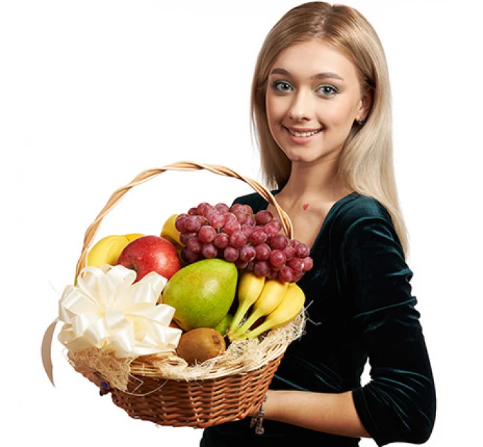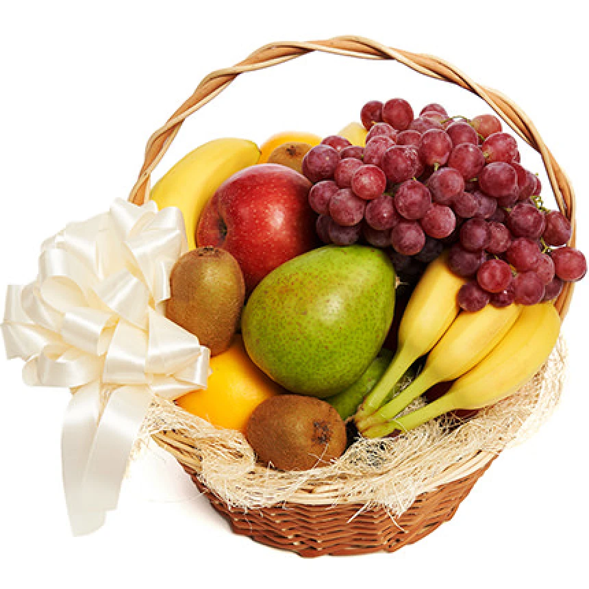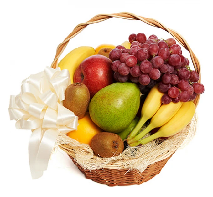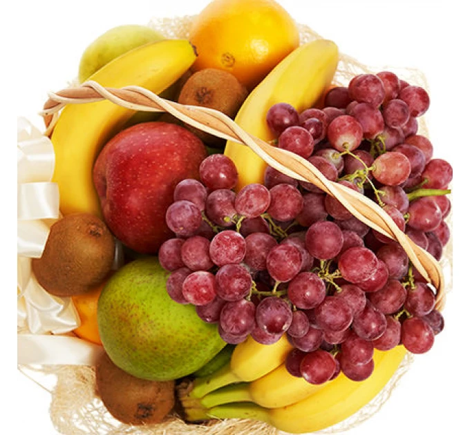 винограду, банани, апельсини, яблука, ківі, груша, кошик, декор. (Кошик фруктів доставляється в прозорій целофановій упаковці.)