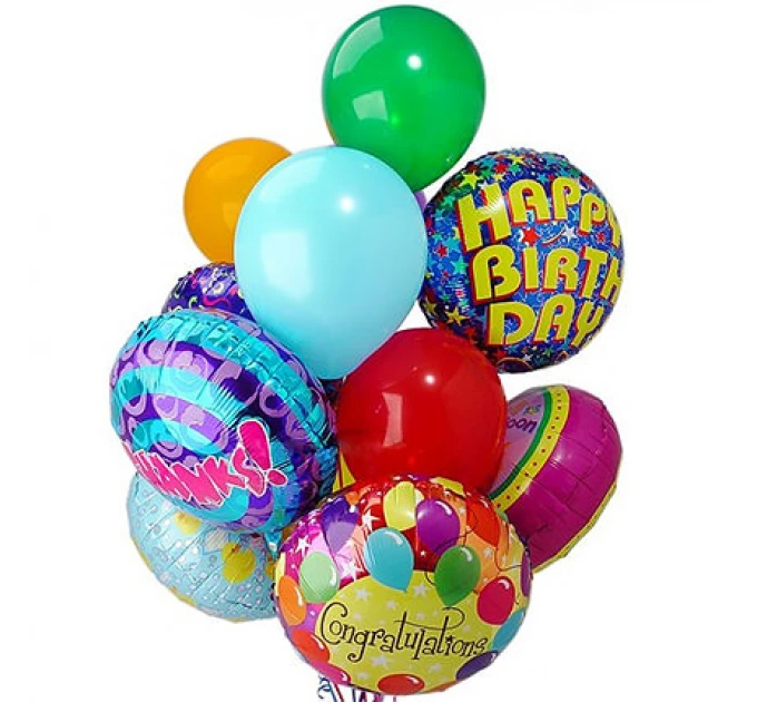 Опис: Зв'язування яскравих та святкових повітряних кульок стане чудовим подарунком до дня народження дитини та навіть дорослої, адже в душі всі ми діти, які очікують яскравого та казкового свята! Ми додаємо в кулю спеціальний розчин, який збільшує час польоту куль у 4-5 разів (від 2-х днів до 2-х тижнів) – яскраві кулі довго радуватимуть Вашого одержувача! Склад: 5 фольгованих гелієвих кульок, 4 латексні гелієві кульки. (Кульки в асортименті. Кулі можуть бути замінені на однотипні, у разі відсутності даної моделі на складі. Колір та форма кульок можуть бути змінені за Вашим бажанням. Для уточнення заміни зв'яжіться, будь ласка, з нашим менеджером.) Колір: кольоровий.
