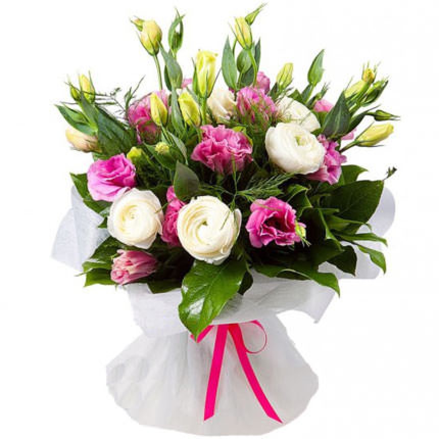 5 білих троянд, 8 гілок ніжної еустоми, зелень, оформлення.