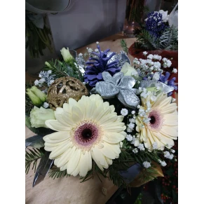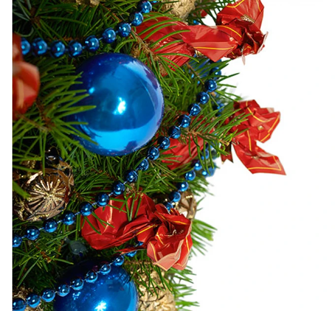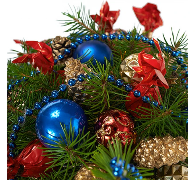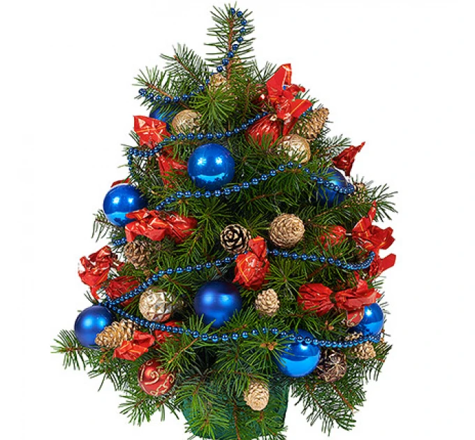 Опис композиції: Маленька настільна ялинка прикрасить Ваш інтер'єр і нагадуватиме про настання чудового свята! Склад: 15 шоколадних цукерок, новорічні прикраси, шишки, ялинові гілки, флористичний матеріал. Висота ялинки: до 40 см.