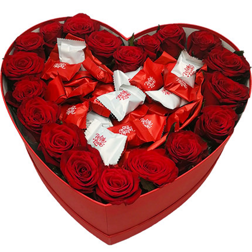 Описание композиции: Сердце из красных роз и конфеты "Любимов" - классическое и всегда актуальное сочетание цветов и шоколада! Состав композиции: 19 красных роз, конфеты "Любимов" - 24 шт., декоративная коробка в форме сердца, флористический материал.
