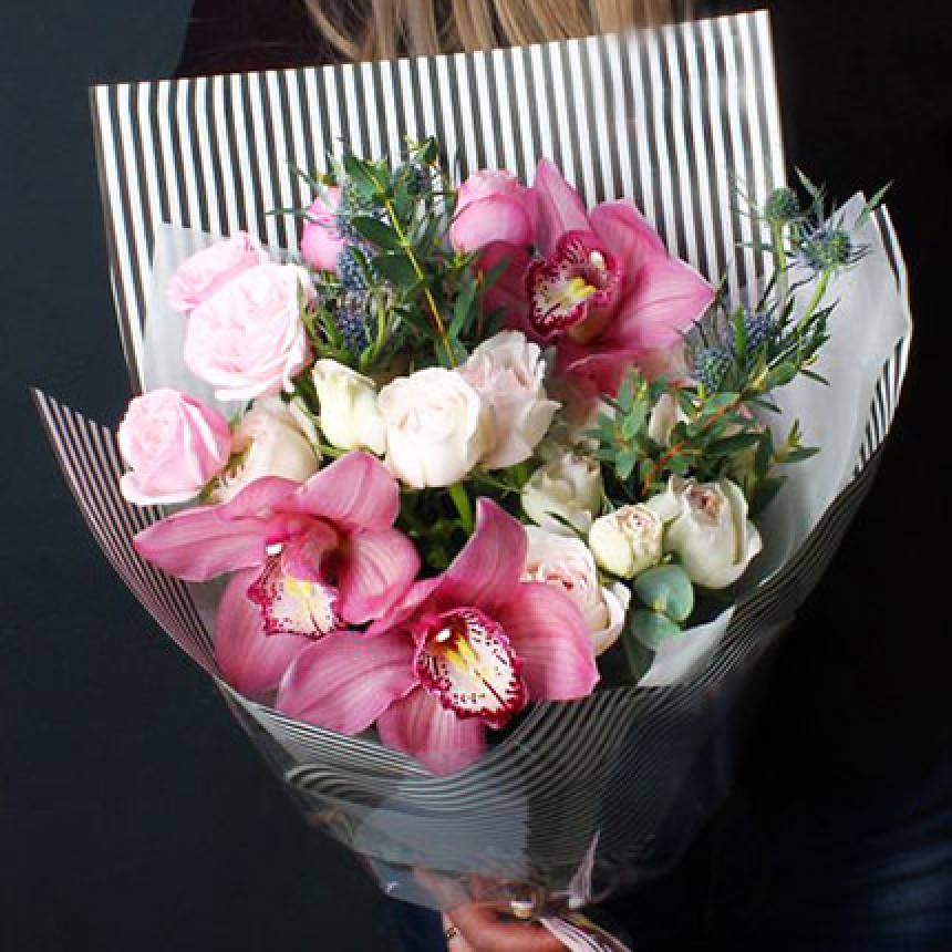 3 цветка орхидеи, 6 веток кремовой и розовой кустовой розы, 2 эрингиума, эвкалипт, оформление может отличаться.