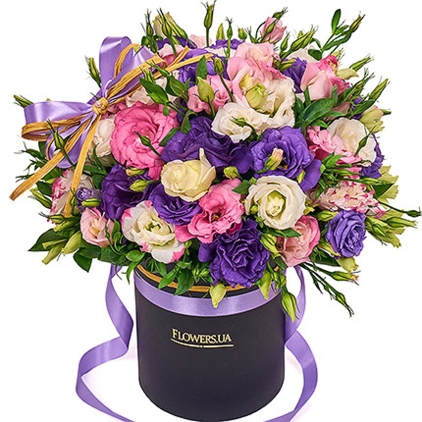 19 веток розовых, белых и фиолетовых эустом, декоративная коробка, флористический материал.