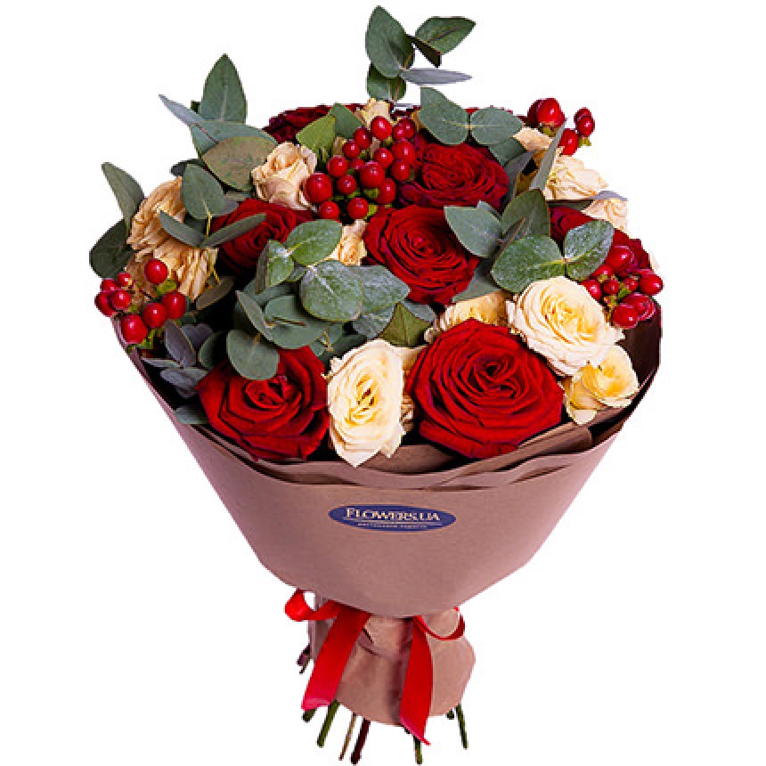 9 красных роз, 4 ветки кустовой кремовой розы, гиперикум, эвкалипт, оформление.