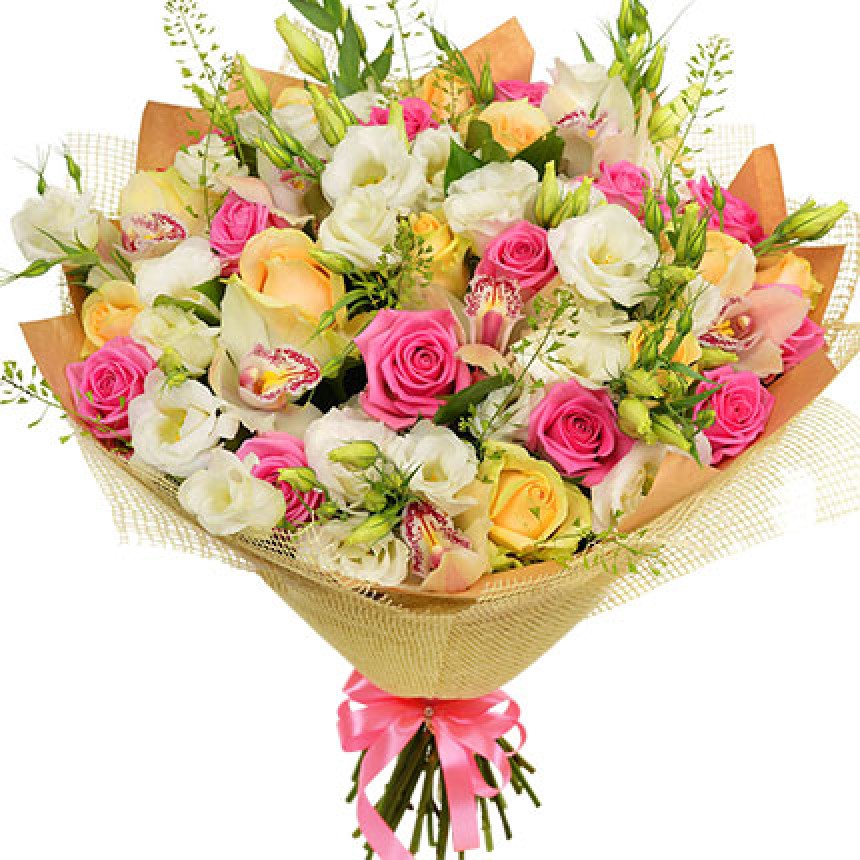 25 розовых и кремовых роз, 7 цветков орхидеи, 7 веток нежной эустомы, зелень, оформление может отличаться.