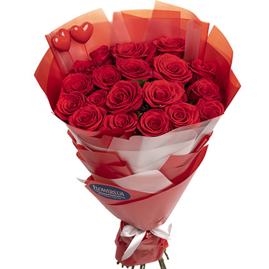 Красные розы всегда в тренде! С добавлением необычной изюминки в виде сердец этот яркий букет передаст любимой пылкость Ваших чувств!