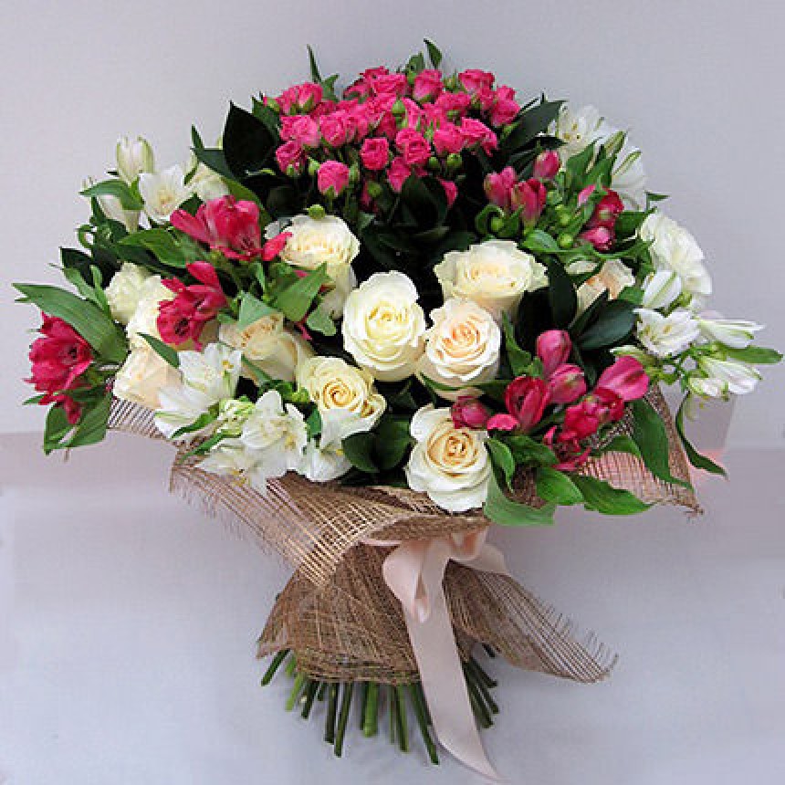25 белых роз, 5 веток кустовой розовой розы, альстромерии, зелень, оформление.