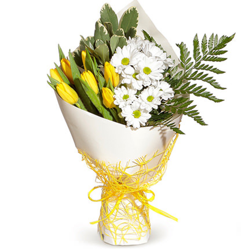 7 желтых тюльпанов, ветка белой ромашковой хризантемы, зелень, оформление.