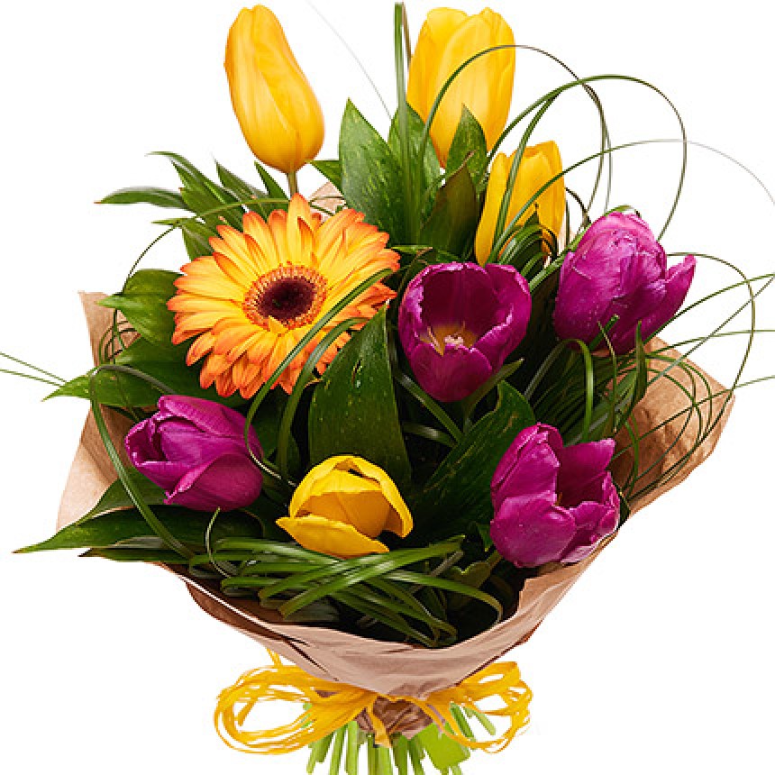 1 гербера, 8 желтых и розовых тюльпанов, зелень, оформление.