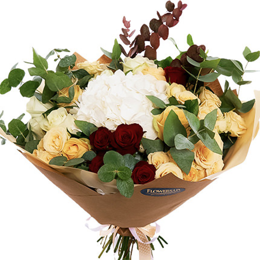 гортензия, 14 белых, кремовых и красных роз, 6 веток кустовой кремовой розы, эвкалипт, оформление.