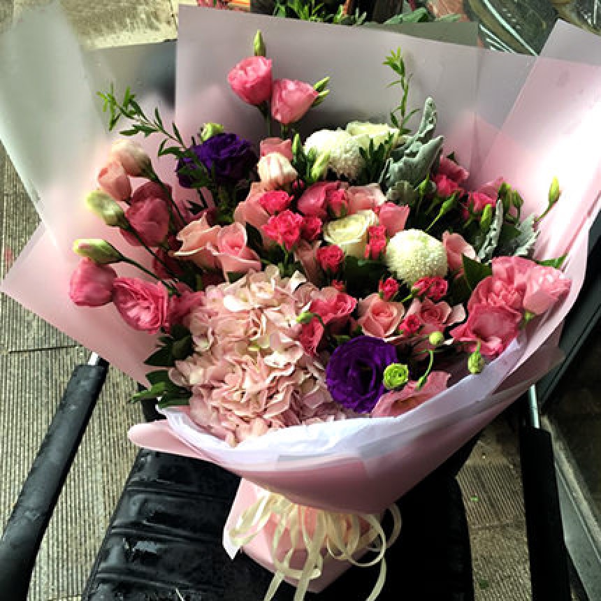 Описание букета: Букет для единственной, самой нежной и неповторимой! Говорите о своих чувствах элегантно... на языке цветов! Состав: гортензия, 15 белых и розовых роз, 8 веток розовой и фиолетовой эустомы, 6 веток кустовой розовой розы, зелень, оформление.