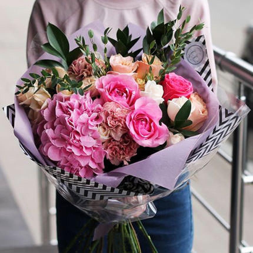 гортензия, 11 кремовых, розовых и белых роз, 3 гвоздик, зелень, оформление может отличаться.
