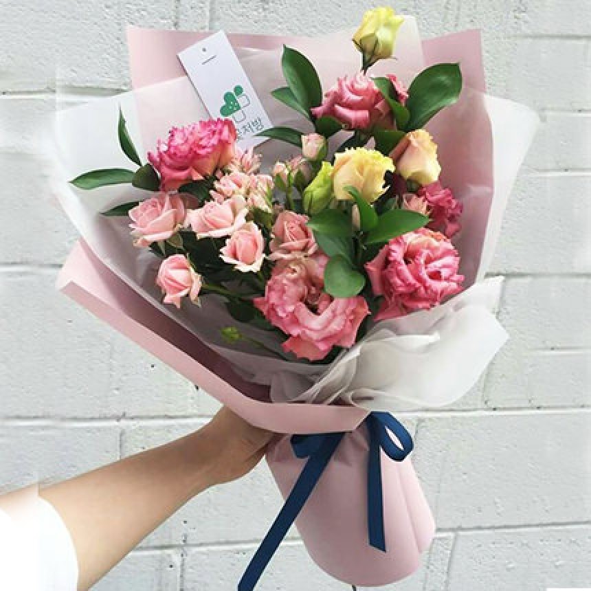 3 ветки кустовой розовой розы, 2 ветки белой и розовой эустомы, зелень, оформление.