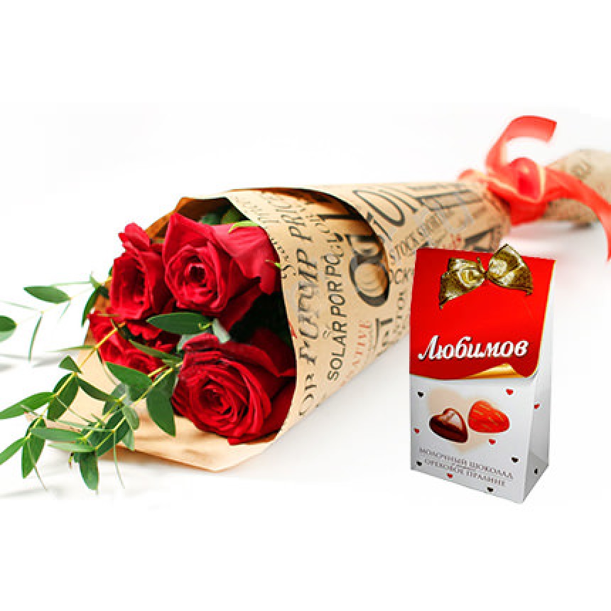 5 красных роз, зелень и оформление может отличаться , конфеты "Любимов" - 100 гр.