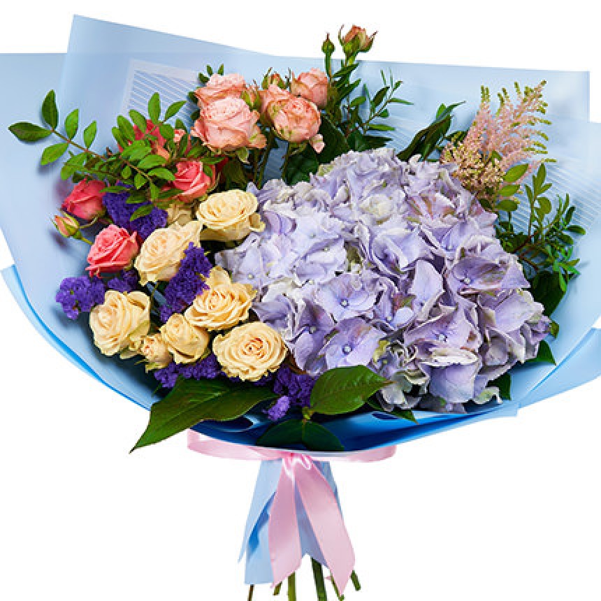 гортензия, 4 ветки кустовой кремовой и розовой розы, статица, астильба, зелень, оформление.