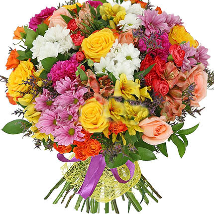 10 разноцветных роз, 8 веток разноцветной хризантемы, 5 веток кустовой розы, 5 гвоздик, 5 альстромерий, зелень, оформление.