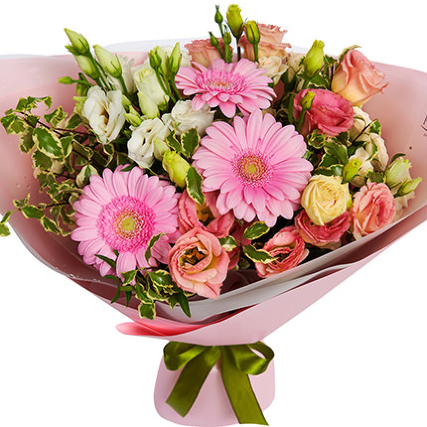 6 веток белой и розовой эустомы, 3 герберы, зелень, оформление.