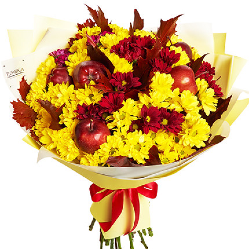 13 веток желтой и бордовой хризантемы, 5 яблок, декоративные листья, оформление.