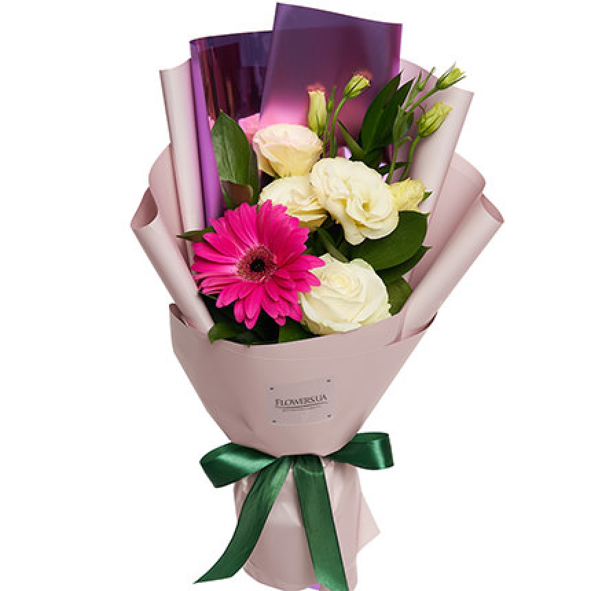 1 белая роза, 1 розовая гербера, ветка нежной эустомы, зелень, оформление.