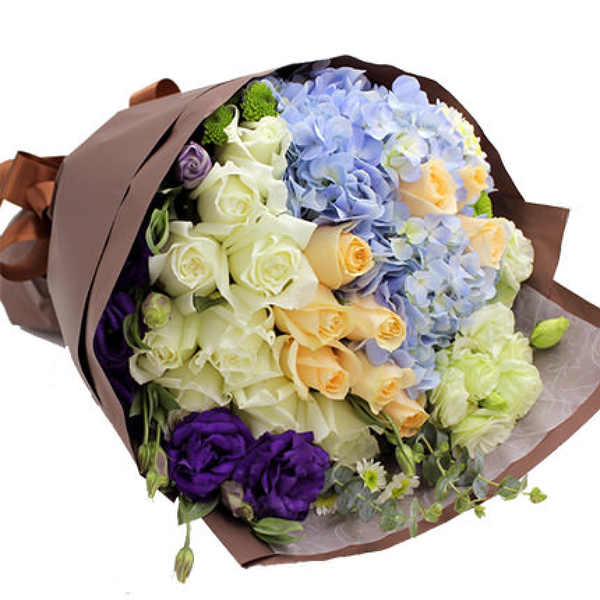 гортензия, 21 белая и кремовая роза, 3 ветки белой и фиолетовой эустомы, 2 зеленые хризантемы, эвкалипт, оформление.