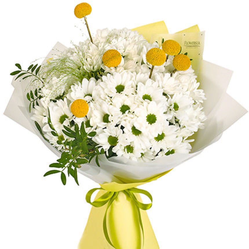 9 веток белой ромашковой хризантемы, 6 веток краспедии, зелень, оформление.