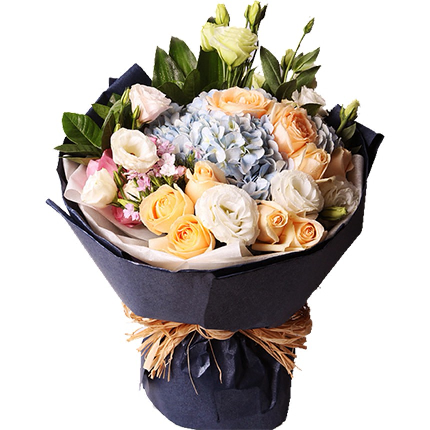 гортензия, 9 кремовых роз, 5 веток нежной эустомы, зелень, оформление может отличаться.