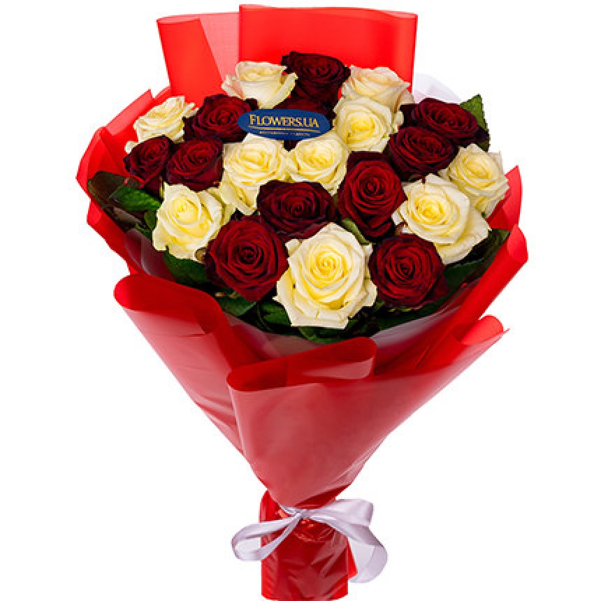 : 21 белая и красная роза, высота - 60 см., оформление.